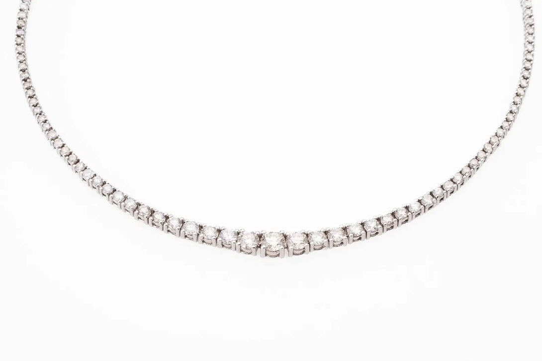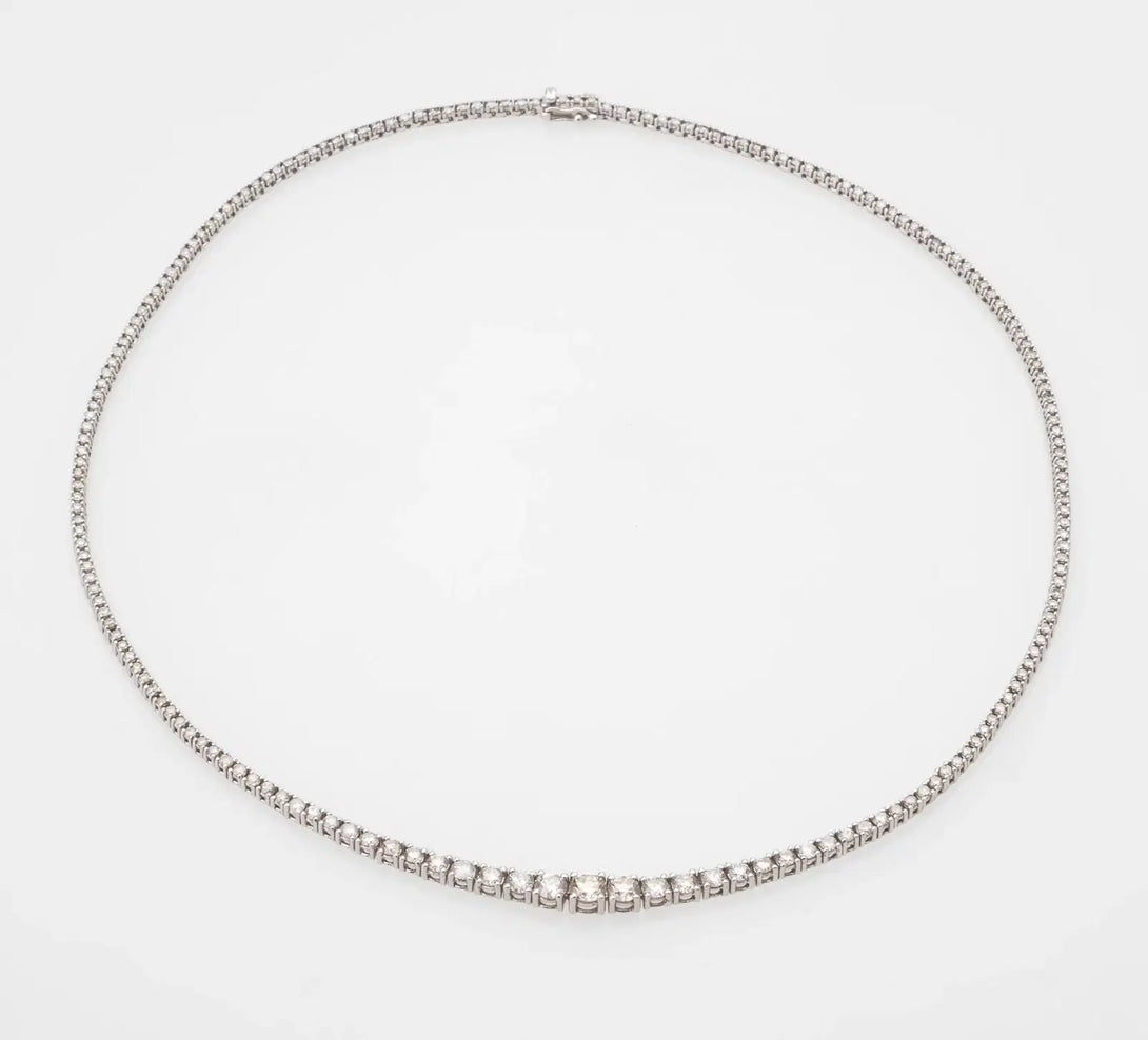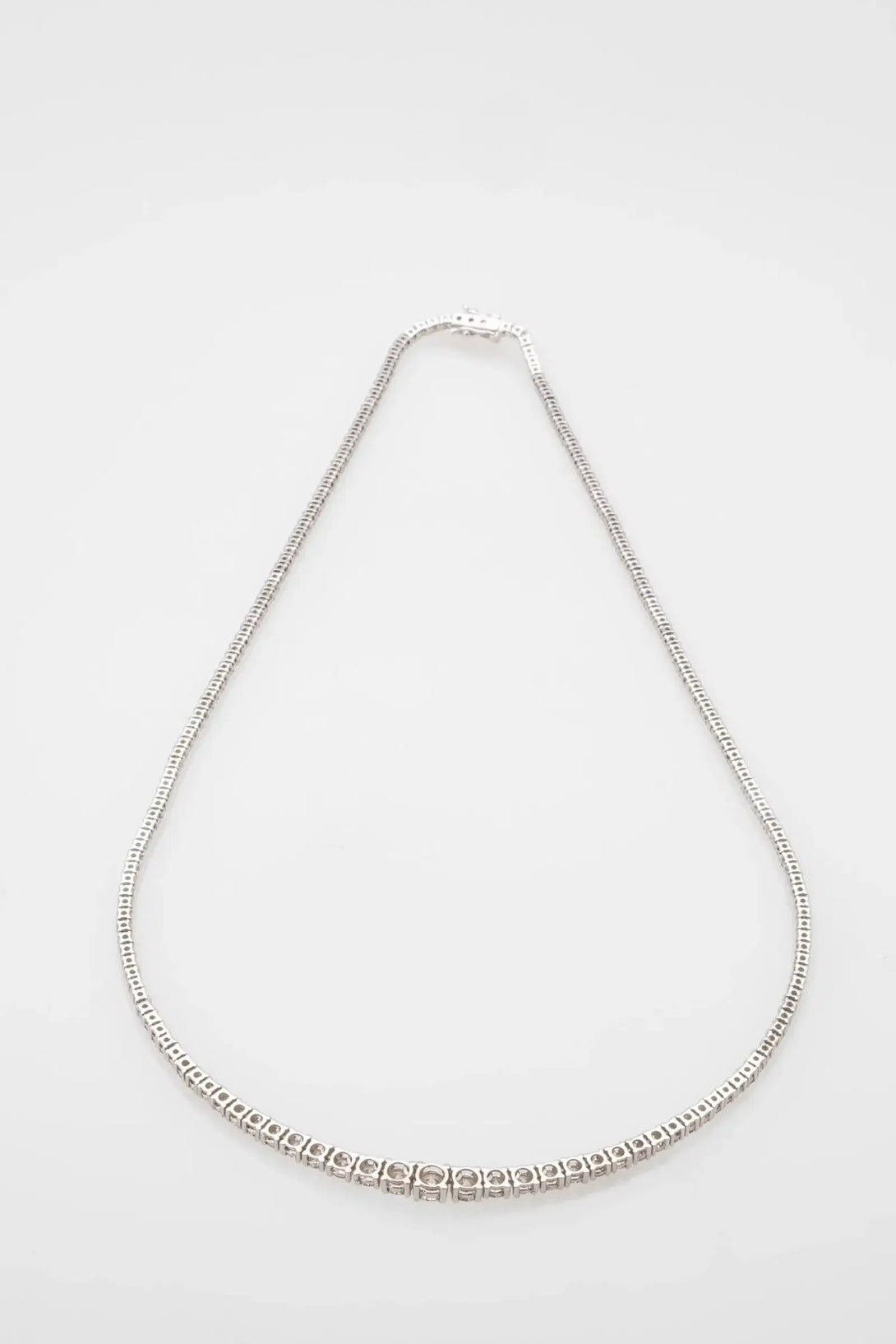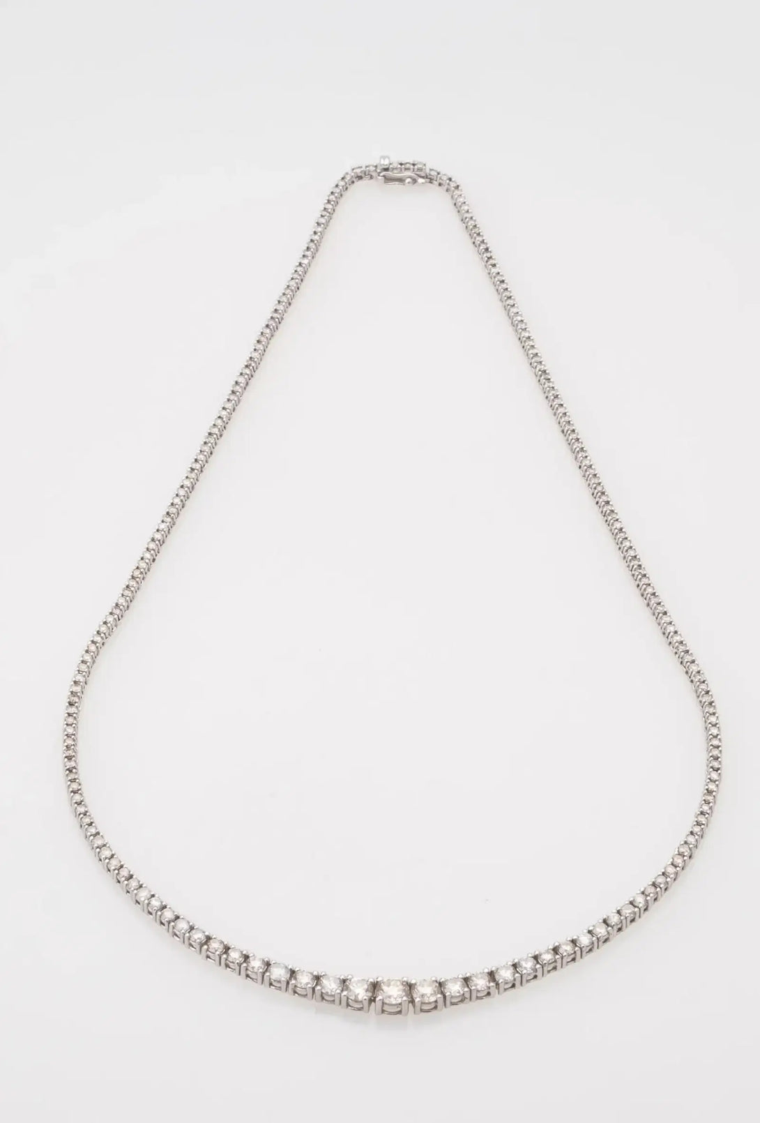 The popularity of the tennis bracelet soon translated into the creation of the tennis necklace, a longer and more lavish adaptation of its predecessor. Tennis necklaces are characterised by a continuous line of diamonds or other precious stones set in a delicate, intricate pattern that wraps around the neck, exuding elegance and timeless beauty. The design typically features a series of individually set stones, often diamonds, held together by thin, almost invisible links, creating a seamless and shimmering effect. This exquisite piece of jewellery quickly gained popularity among celebrities, fashion icons, and jewellery enthusiasts, cementing its status as a must-have accessory for special occasions and red-carpet events.
