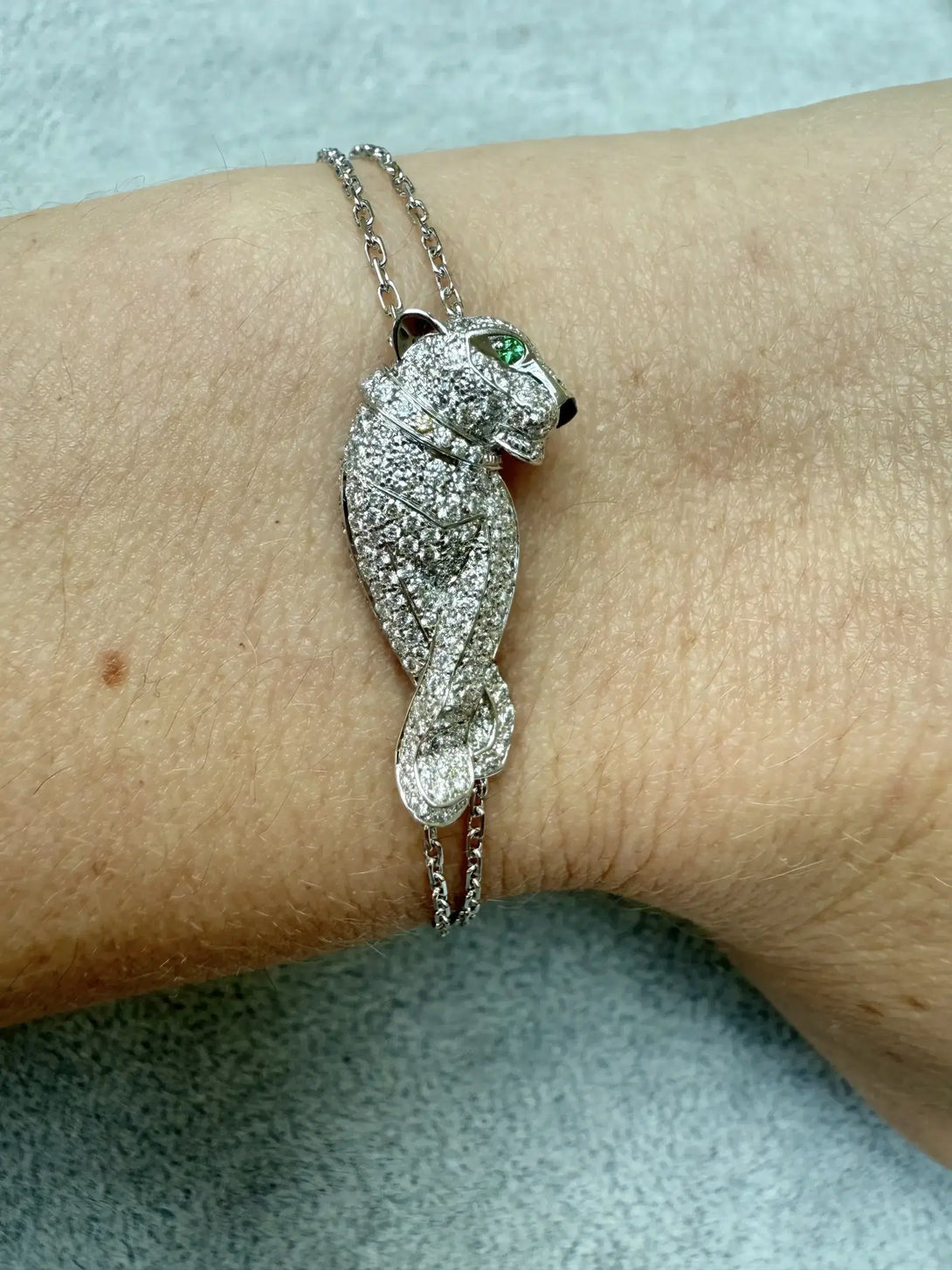The Panthère diamond bracelet is the ultimate evolution of this design language. Crafted in 18k gold or platinum, its fluid, articulated links mimic the panther’s supple movements. The head of the panther—pavé-set with diamonds and accented with emerald or tsavorite eyes—rests elegantly around the wrist, exuding strength and sensuality.