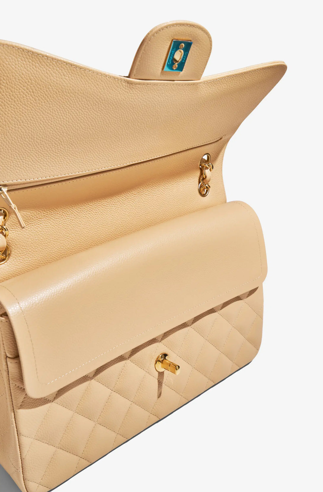 The Chanel Classic Jumbo bag, an iconic piece in the world of luxury fashion, traces its origins back to the brand’s founder, Coco Chanel. Introduced as part of the timeless Chanel 2.55 series in February 1955, the Jumbo bag emerged as a larger variant of the classic flap bag, designed to offer more space while maintaining the elegant aesthetics that Chanel is renowned for. This bag features the distinctive quilted leather, the interlocking CC logo, and the sophisticated chain strap intertwined with leather. Over the decades, the Chanel Jumbo bag has evolved, with Karl Lagerfeld, Chanel’s creative director from 1983 to 2019, introducing updates like the signature double C turn-lock clasp, further solidifying its status as a coveted fashion statement.