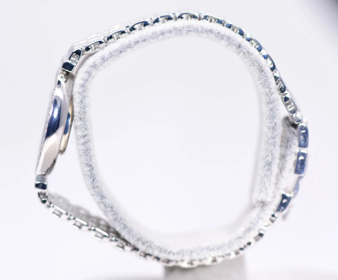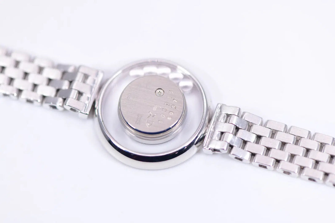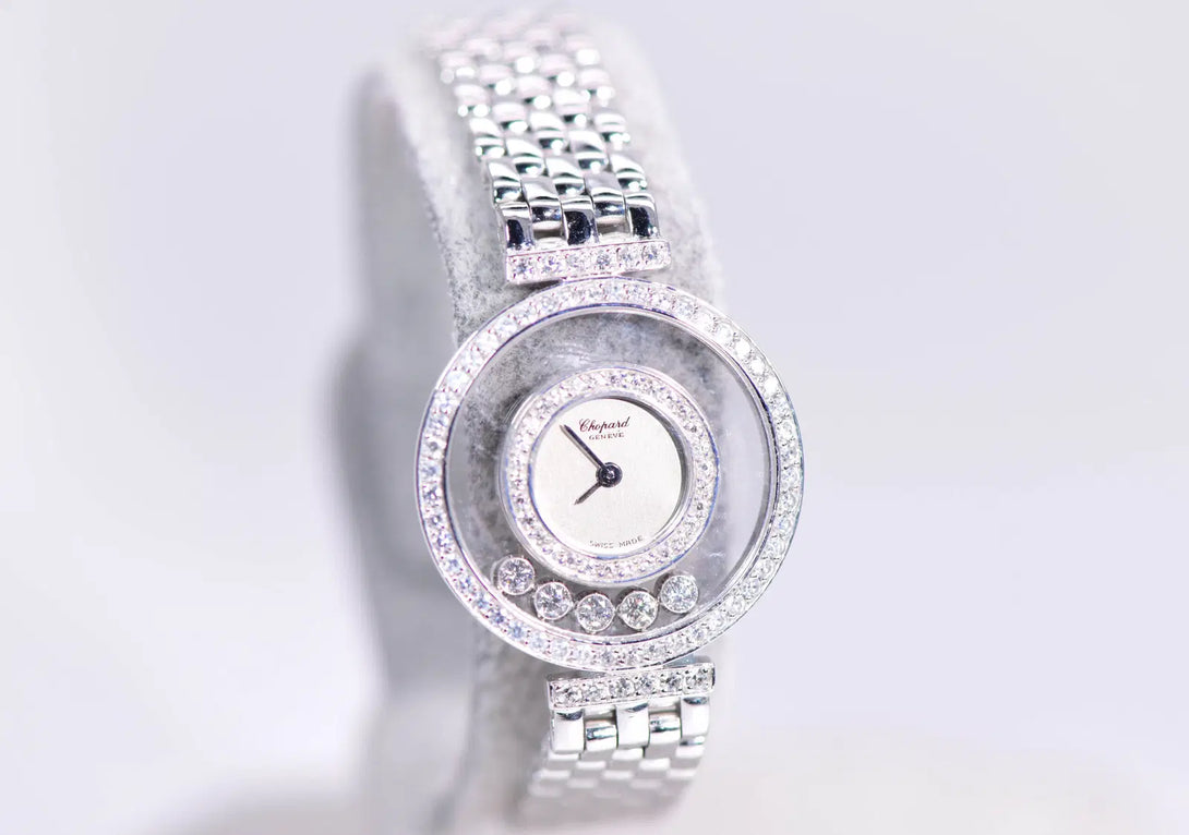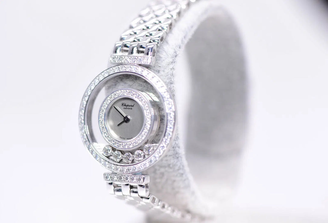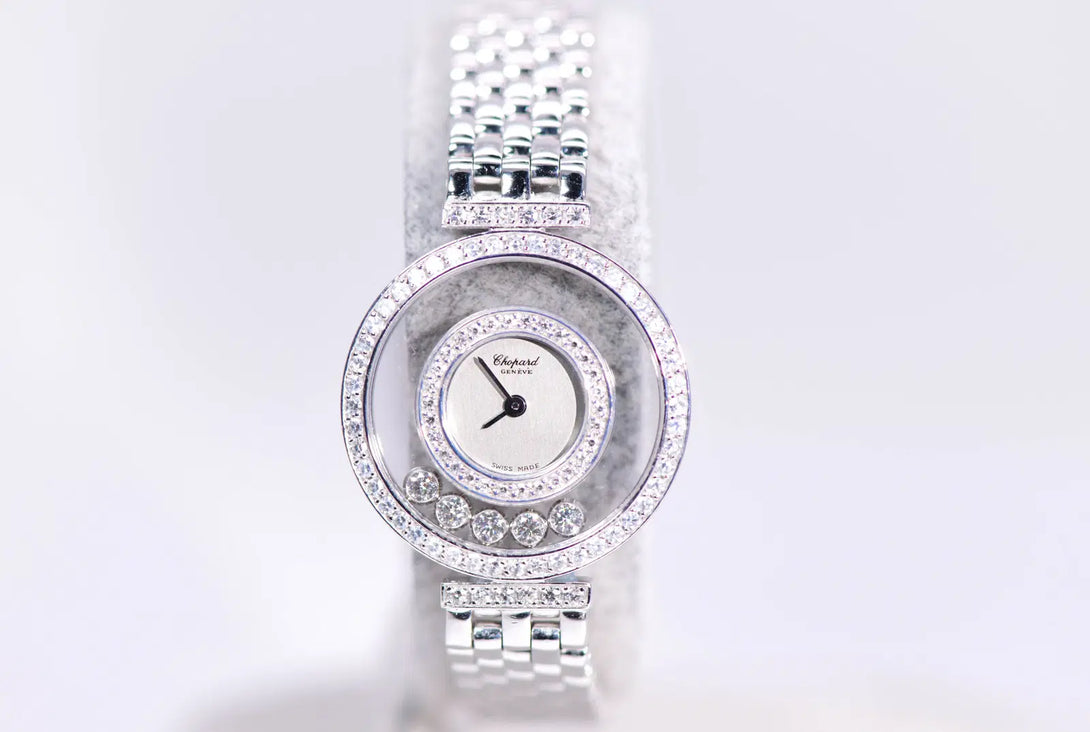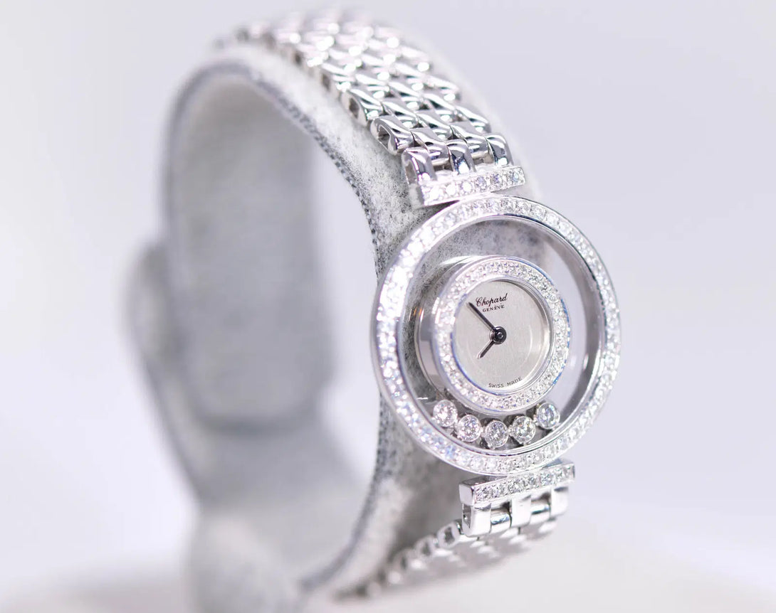 This Chopard Happy Diamond Icons White Gold Ladies watch is part of the ‘Happy Diamonds’ range. Chopard’s ‘Happy Diamonds’ line was first introduced in 1976 by Chopard designer Ronald Kurowski. It presented for the first time a men’s watch case that secured movable ‘free-floating’ or ‘dancing’ diamonds between two pieces of sapphire glass which enabled the diamonds to move together with the movements of the wearer’s wrists. The idea was transposed to the first piece of Chopard jewellery in 1983, with the launch of the Chopard ‘Happy Clown’ an 18k yellow gold clown pendant set with a glass tummy that secured free-floating ‘dancing’ diamonds and gems. The setting is one of the most innovative and popular in modern jewellery history and is a trademark of the Chopard house.