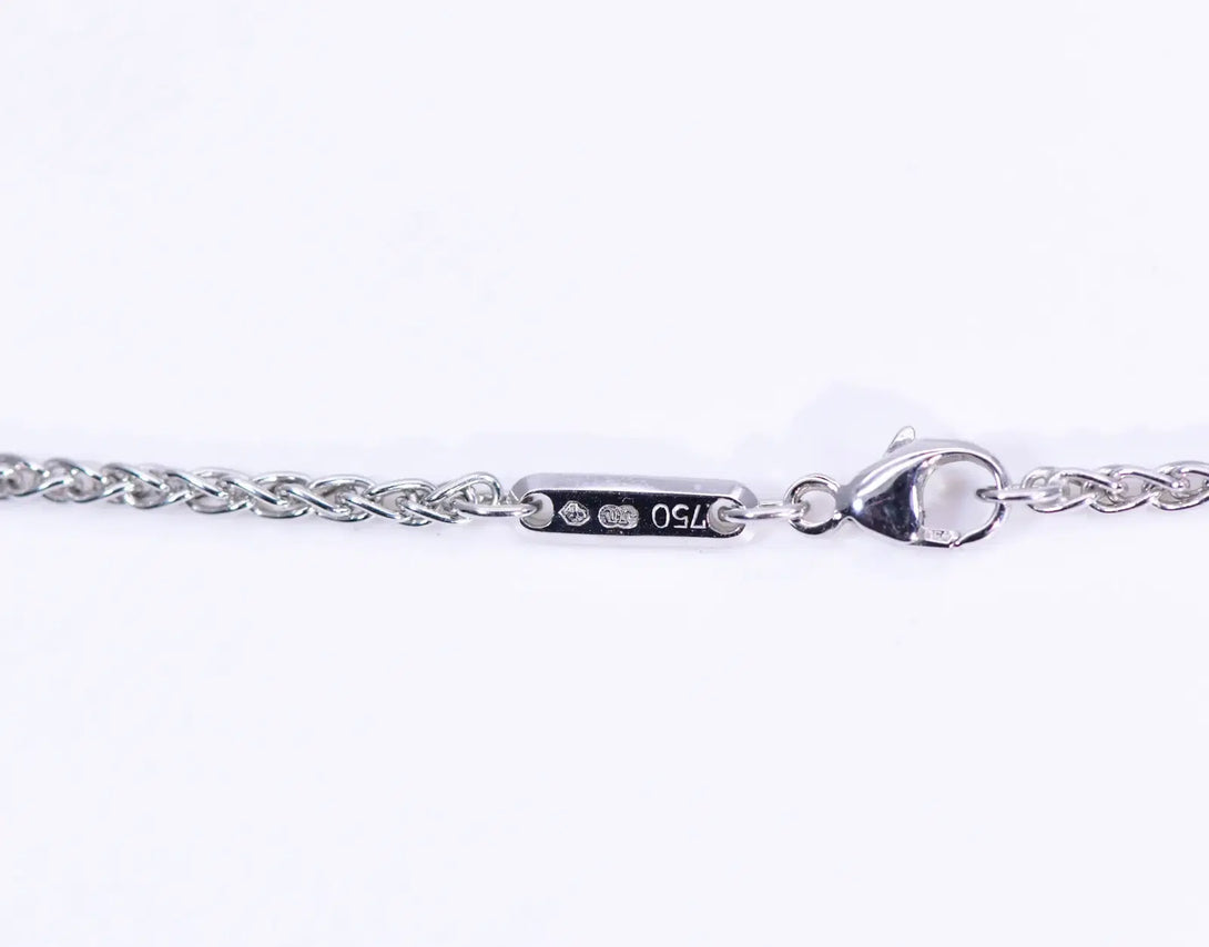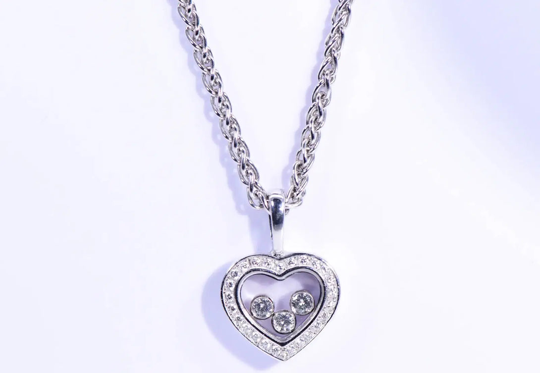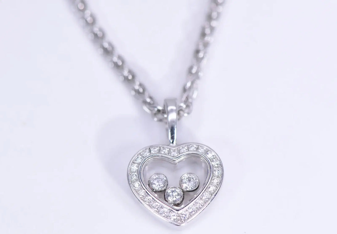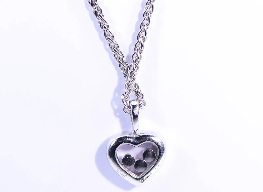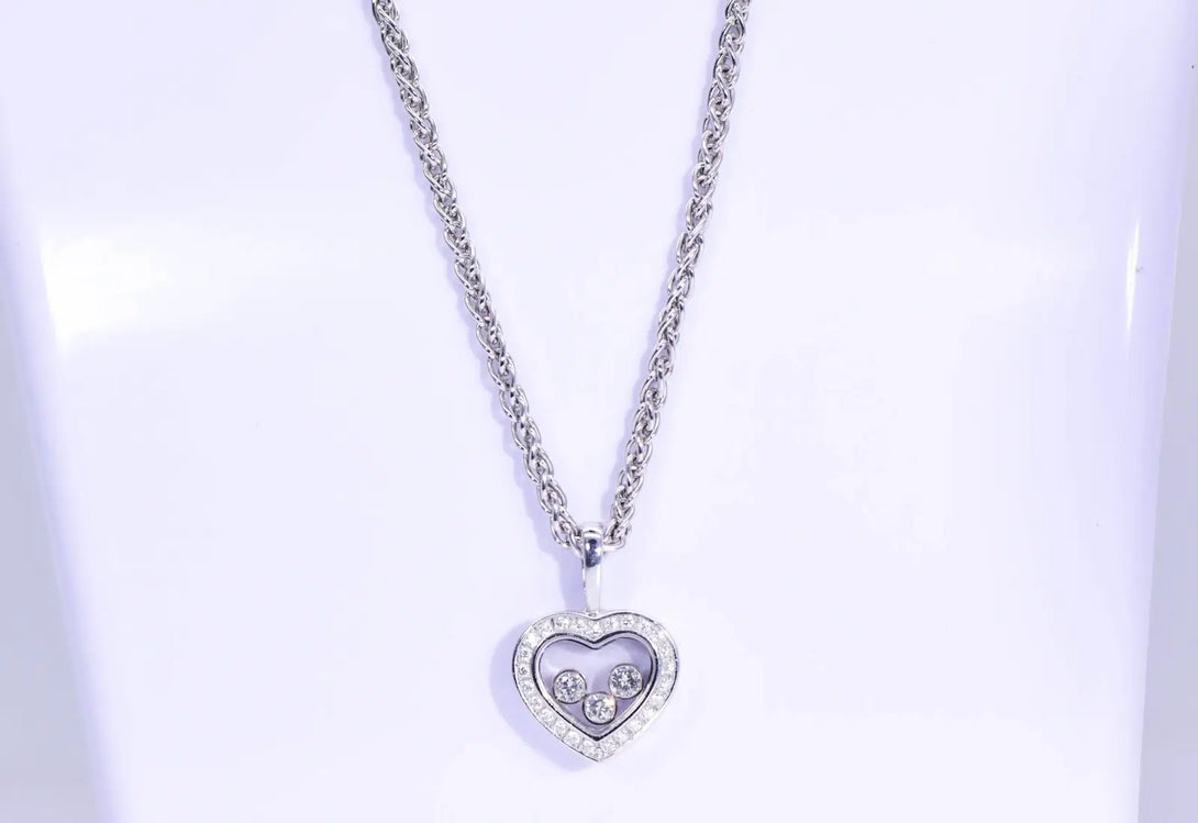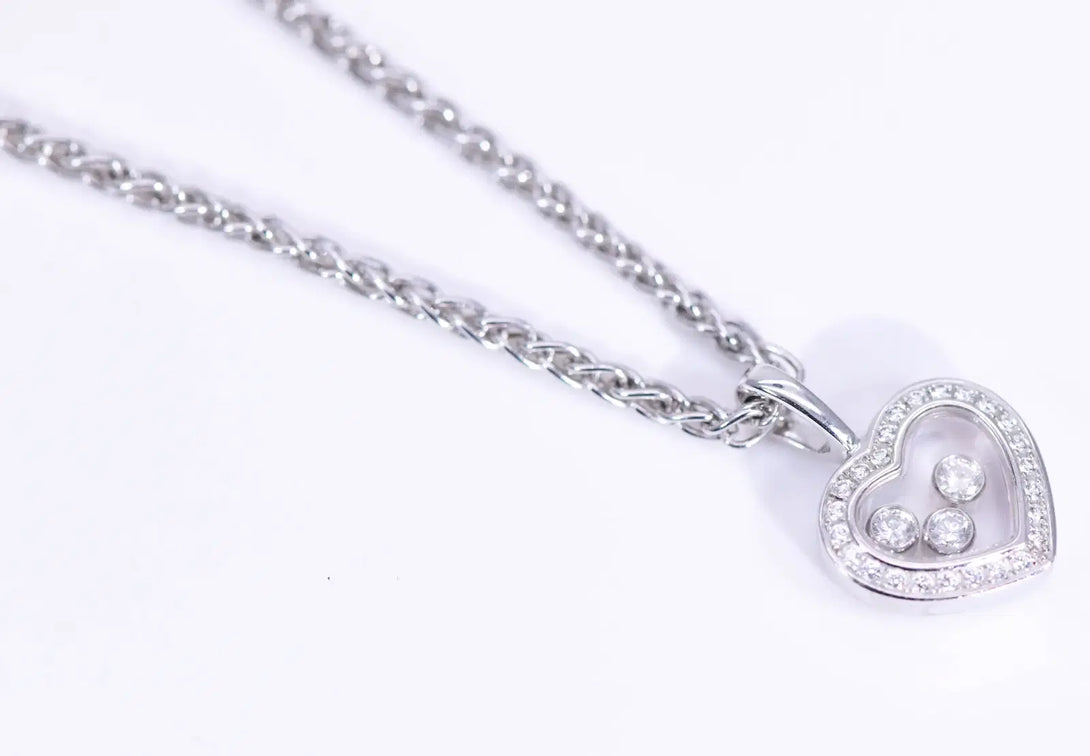 The Chopard Happy Diamonds 18k White Gold Heart Necklace is part of the ‘Happy Diamonds’ range. Chopard’s ‘Happy Diamonds’ line was first introduced in 1976 by Chopard designer Ronald Kurowski. It presented for the first time a men’s watch case that secured movable ‘free-floating’ or ‘dancing’ diamonds between two pieces of sapphire glass which enabled the diamonds to move together with the movements of the wearer’s wrists. The idea was transposed to the first piece of Chopard jewellery in 1983, with the launch of the Chopard ‘Happy Clown’ an 18k yellow gold clown pendant set with a glass tummy that secured free-floating ‘dancing’ diamonds and gems. The setting is one of the most innovative and popular in modern jewellery history and is a trademark of the Chopard house.
