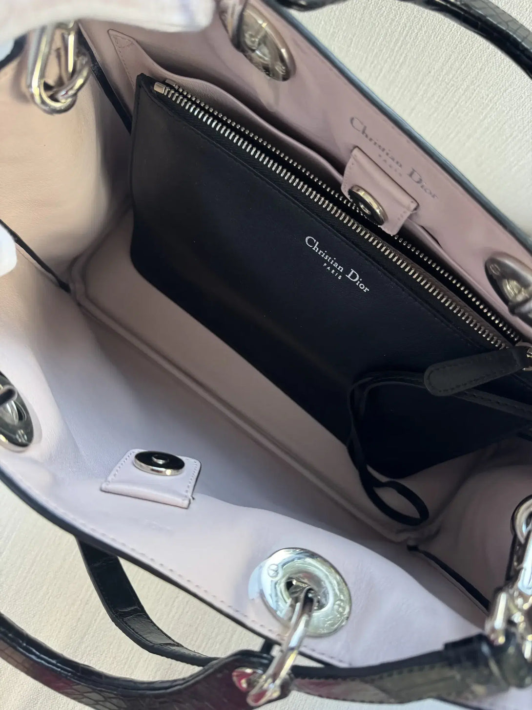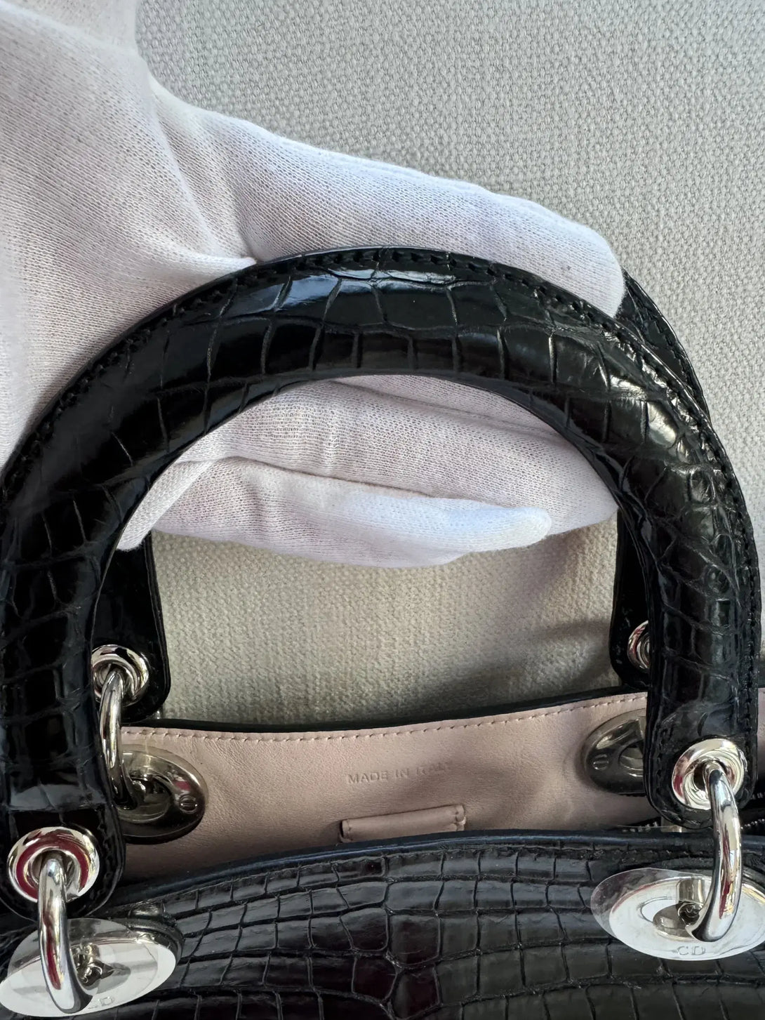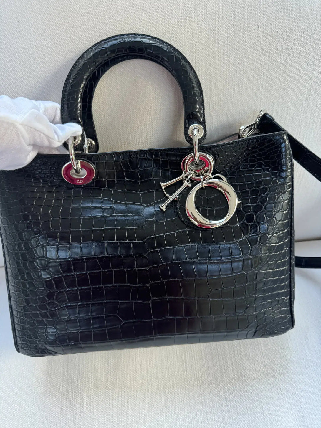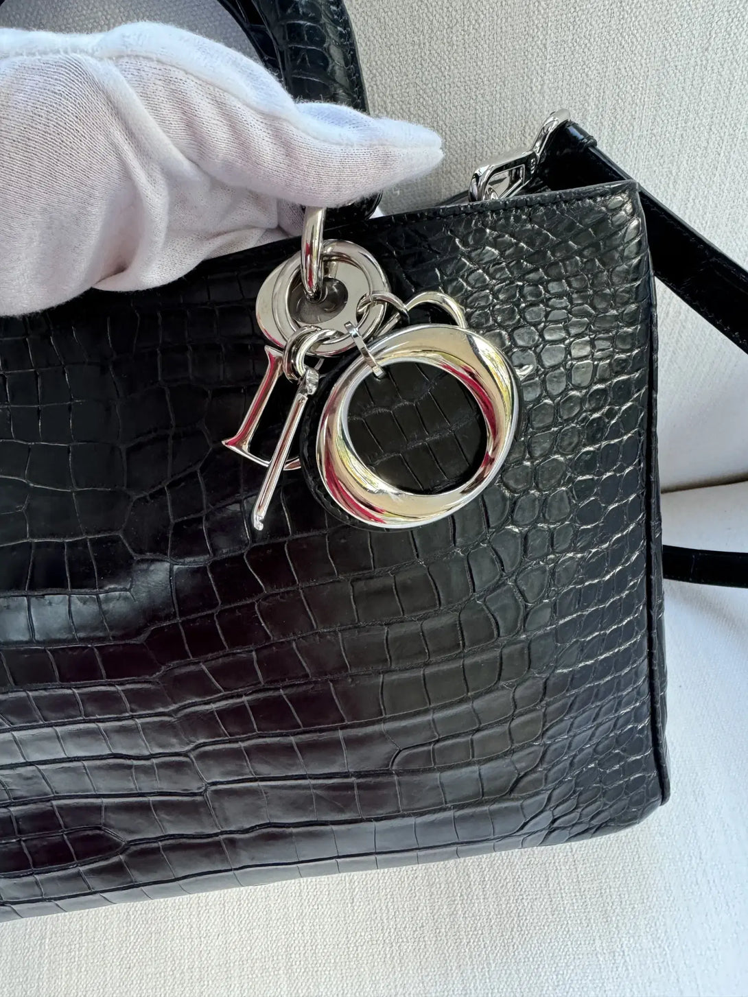 One of the standout features of the Diorissimo bag is its structured yet slightly relaxed shape, providing an air of sophistication and versatility. It is spacious enough for daily essentials, but its sleek profile ensures it remains a refined accessory. The Diorissimo Crocodile Bag is typically available in a range of classic colors, such as deep black, rich burgundy, and elegant shades of brown and beige, which emphasize the natural beauty of the crocodile leather and cater to various style preferences. The bag often features minimal branding, with only a discreet “Dior” tag and the brand’s signature charms hanging from the handle, adding a touch of whimsy to the design without overpowering it.