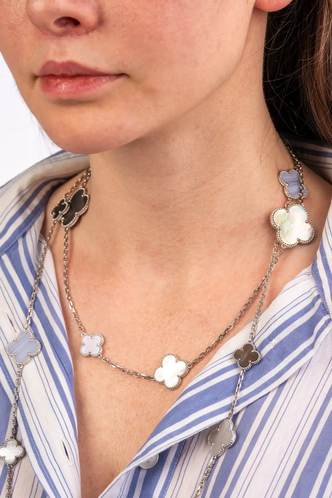 Van Cleef & Arpels Magic Alhambra Long Necklace, 16 Motifs 18k White Gold Mother of Pearl